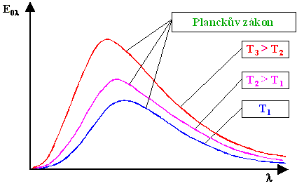 Vztah (2-2) je matematickou formulací Planckova vyzařovacího zákona a lze jej také vyjádřit graficky, viz obr. 2-2. Na tomto obrázku jsou vykresleny závislosti spektrální hustoty zářivého toku dokonale černého tělesa na vlnové délce záření, a to pro různé teploty zdroje záření. Je zřejmé, že se zvětšující se teplotou zdroje se zvětšuje spektrální hustota zářivého toku dokonale černého tělesa a maximální hodnota spektrální hustoty zářivého toku se posouvá ke kratším vlnovým délkám.