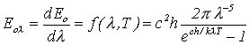V tomto zákoně představuje h Planckovu konstantu, která má hodnotu h = (6,6256 ± 0,0005).10-34 J.s. Z uvedené formulace Planckova vyzařovacího zákona je možné pro dokonale černé těleso (dokonalý zářič) ve vakuu odvodit vztah pro spektrální hustotu zářivého toku dokonale černého tělesa Eol jako funkci vlnové délky záření l a teploty zářiče T