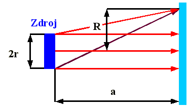 Jelikož bývá velikost zdroje 2r podstatně menší než vzdálenost stínítka od zdroje a, lze daný vztah zjednodušit a dostaneme