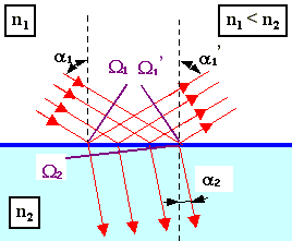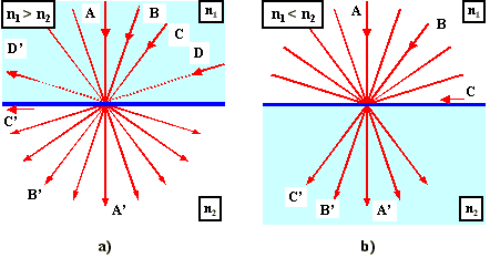 Z uvedeného zákona dále plyne, že při šíření záření z prostředí opticky hustšího do prostředí opticky řidšího, viz obr. 2-14a, se některé paprsky (A, B) lámou do prostředí opticky hustšího a paprsky dopadající na rozhraní příliš šikmo (D) se odrazí zpět. Při šíření záření z prostředí opticky řidšího do prostředí opticky hustšího, viz obr. 2-14b, se sice všechny paprsky dostanou do prostředí opticky hustšího, ale tam se šíří jen v omezeném prostorovém úhlu.