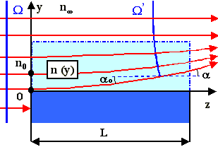 Pro případ šíření záření jednorozměrným nehomogenním transparentním prostředím n = f (y) o délce L, a to ve směru z, viz obr. 2-15, lze Snellův zákon psát ve tvaru