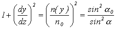 Tato rovnice představuje diferenciální rovnici trajektorie paprsku při šíření jednorozměrným transparentním prostředím, kde no je index lomu na vstupu paprsku do daného prostředí a úhly a a ao z rovnice (2-21) a na obr. 2-15, mají obdobný význam, jako úhly a1, a2 v rovnici (2-20) a na obr. 2-13.