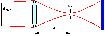 Geometrická optika popisuje transformaci svazku čočkou pouze zjednodušeně. Z hlediska vlnové optiky se jeví čočka jako tzv. fázový převáděč, který prakticky neumožňuje vytvoření paralelního svazku paprsků (a tím i rovinné vlnoplochy) podél nějaké větší vzdálenosti ve směru optické osy. Na obr. 2-17 je uvedena transformace Gaussovského svazku čočkou z pohledu vlnové optiky. Skutečně paralelní může být svazek paprsků pouze v úzkém rozmezí vzdáleností, a to v okolí minimálního průměru svazku dmin, přičemž v ohnisku je průměr svazku nenulový a má hodnotu df. Gaussovský svazek bývá generován především lasery a kromě koherence se vyznačuje tím, že v příčném řezu má Gaussovské rozložení intenzity záření s maximem intenzity ve středu svazku.