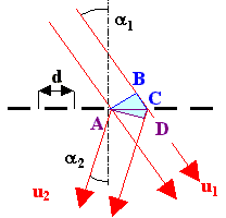 Dopadá-li rovinná vlna záření u1 o vlnové délce l na periodickou mřížku s roztečí štěrbin d, viz obr. 2-19, část záření se šíří v původním směru a část vlny u2 se ohýbá. Hrany mřížky lze přitom považovat za sekundární bodové zdroje záření, od kterých se šíří paprsky do všech směrů. Je-li dráhový rozdíl paprsků od okrajů štěrbiny roven celistvému násobku vlnových délek, dojde v daném směru k zesílení záření a platí