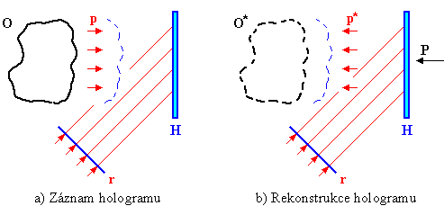 Princip holografického záznamu a následnou rekonstrukci trojrozměrného obrazu si lze vysvětlit pomocí schématu uvedeného na obr. 2-27. Při záznamu je objekt O osvětlen a předmětový svazek p šířící se od objektu interferuje s referenčním svazkem r a vzniklá mikro interferenční struktura exponuje holografickou desku H. Po vyvolání holografické desky je třeba tuto desku osvětlit rekonstrukčním svazkem, který by měl být shodný s referenčním svazkem r. Na mikro interferenční struktuře dojde k ohybu paprsků a vytvoří se zpětně rekonstruovaný předmětový svazek p*, který je shodný s původním předmětovým svazkem p. Důkazem shody mohou být rovnice (2-25) z kap. 2.13 pro interferenci a (2-28) z kap. 2.14 pro difrakci, které jsou pro k = 1 shodné. Pozorovatel může pak ve směru P skrz holografickou desku pozorovat rekonstruovaný obraz O* původního objektu O.