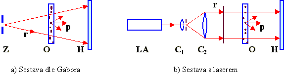 V době vzniku holografie neměl Dennis Gabor k dispozici intenzívní zdroj koherentního záření a fotografické materiály s velkým rozlišením. Z tohoto důvodu zvolil souosou holografickou sestavu, která je prakticky použitelná pouze pro záznam transparentních objektů, viz obr. 2-29a. V takové sestavě dochází k interferenci předmětového svazku p, představujícího záření od ohraničených nehomogenit v objektu, a referenčního svazku r, který prochází transparentním objektem O mimo nehomogenity. Souosé holografické sestavy se v současnosti využívají např. pro záznam částic v transparentním objektu, viz obr. 2-29b. Takové sestavy pracují s paralelním svazkem r, jako zdroj používají laser LA, a pro odstranění parazitní interference v laseru a na čočce C1 slouží prostorový filtr – clona za čočkou C1.