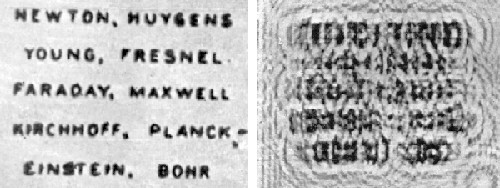 Ukázky transparentního objektu (textu napsaném na skle – obr. 2-30 vlevo) a záznamu prvního hologramu tohoto objektu, získaného Dennisem Gaborem v rovině fotografické desky, jsou uvedeny na obr. 2-30. Po rekonstrukci záznamu (obr. 2-30 vpravo) lze získat opět původní objekt (obr. 2-30 vlevo).