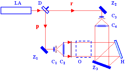 Obr. 2-31 Schéma mimoosové holografické sestavy pro záznam transparentních objektů (LA laser, D dělič, Z zrcadla, C čočky, H fotografická deska - hologram, O transparentní objekt, p předmětový svazek, r referenční svazek)