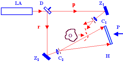 Obr. 2-32 Sestava s dělením amplitudy pro holografický záznam objektu s difúzním povrchem (LA laser, D dělič, Z zrcadla, C čočky, O objekt, H fotografická deska - hologram, P směr pozorování při rekonstrukci, p předmětový svazek, r referenční svazek)
