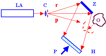 Obr. 2-33 Sestava s dělením vlnoplochy pro holografický záznam objektu s difúzním povrchem (LA laser, Z zrcadlo, C čočka, O objekt, H fotografická deska - hologram, P směr pozorování při rekonstrukci, p předmětový svazek, r referenční svazek)