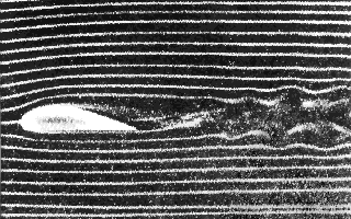 Obr. 3-4 Zviditelnění proudění kolem profilu křídla pomocí kouře – narušení vláken indikuje oblast turbulentního proudění v úplavu [2-15]