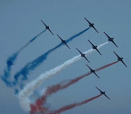Obraz 4: Zviditelnění dráhy letu letadel pomocí různobarevného kouře [6-11].
