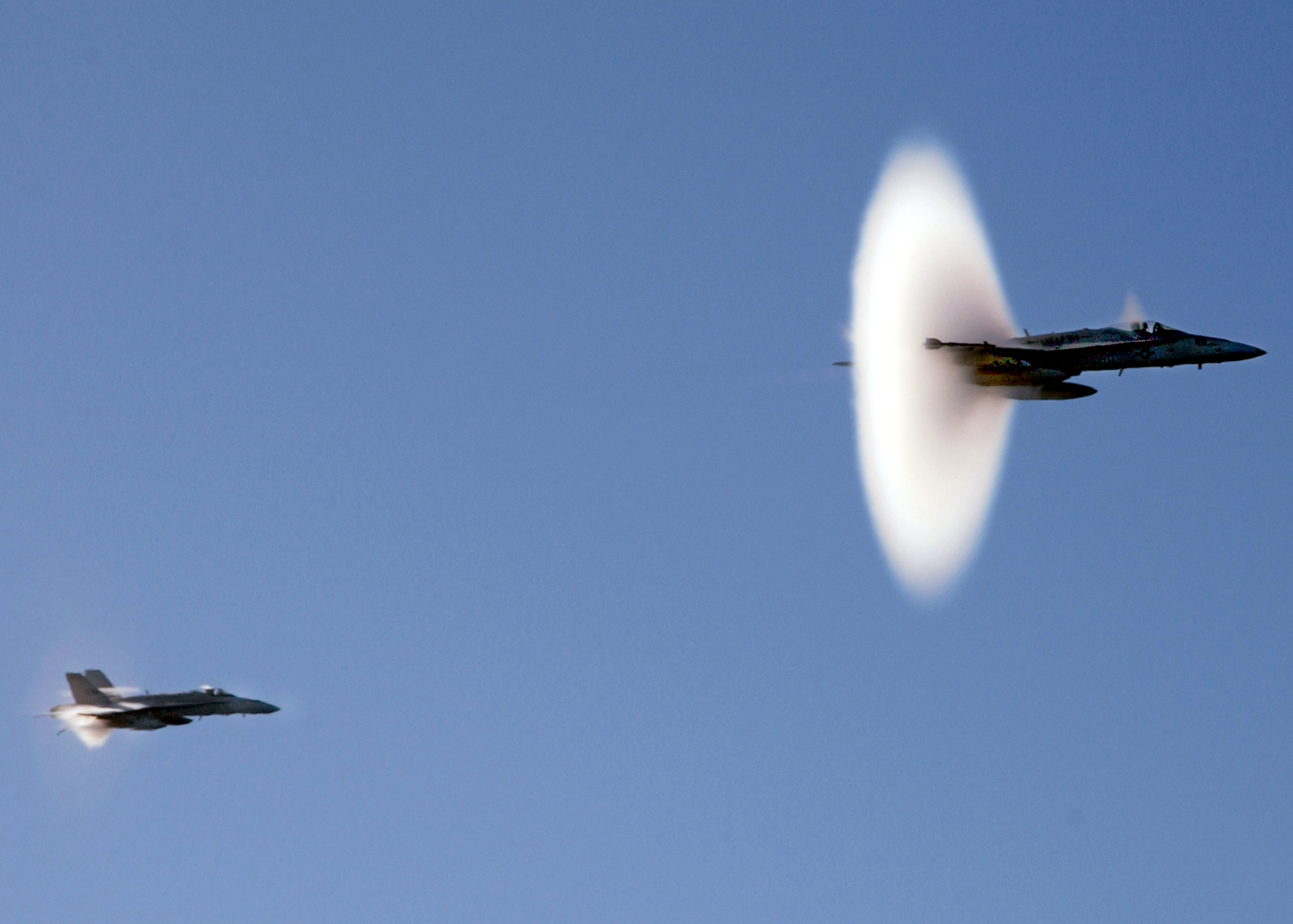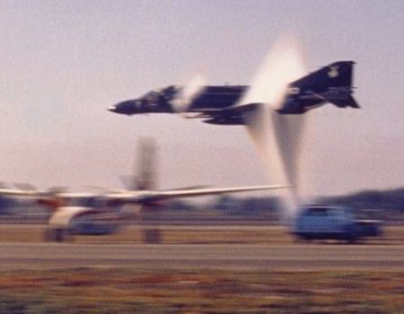 Obraz 8: Zviditelnění rázových vln samovolným vznikem mlhy v okolí letadla pohybujícího se nadzvukovou rychlostí [6-11].