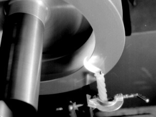 Často používaným indikátorem proudu a směru proudu bývá tenký dlouhý laminární plamen hořáku, někdy lze použít i plamen svíčky. Příklad zviditelnění proudění plamenem svíčky v okolí kola radiálního ventilátoru je uveden na obr. 3-6. Plamen je umístěn k sacímu otvoru do blízkosti lopatek oběžného kola a je strháván proudem vzduchu okolo zakrytování mezi lopatky.