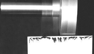 Obr. 3-7 Zviditelnění proudění pomocí niťové sondy na obvodu kola radiálního ventilátoru -Pavelek, Janotková [6-12]