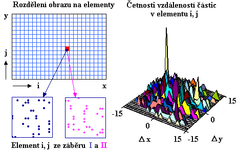 Vyhodnocování posunutí částic Dx a Dy se může provádět různým způsobem. První i druhý záběr obrazu se obvykle rozdělí na elementy, viz obr. 3-16, přičemž element představuje dostatečně malou část obrazu s dostatečným počtem obrazových bodů. Je-li v obrazovém elementu jen jedna zřetelná částice, lze Dx a Dy stanovit snadno z rozdílu polohy částice v záběru II oproti poloze částice v záběru I. Je-li v obrazovém elementu více zřetelných částic a každé částici přiřadíme polohu konkrétního obrazového bodu, lze Dx a Dy stanovit z četností vzdáleností částic v záběru II oproti částicím v záběru I, viz obr. 3-16. Výsledný posuv částic Dx a Dy ve vyšetřovaném elementu je pak dán vzdáleností, která má největší četnost. Jsou-li však polohy částic v obrazových elementech stanoveny přesněji (i mimo polohy obrazových bodů), lze vyhodnocování provádět předchozím způsobem a následně Dx a Dy postupně upřesňovat (dělením Dx a Dy až maximálně do situace, kdy novému Dx a Dy odpovídají alespoň ještě dvě částice). Nejčastěji se však Dx a Dy stanovuje pomocí Fourierovy transformace, kterou lze uplatnit i v obecném případě, a to i pro málo rozlišitelné částice, nebo dokonce při vizualizaci proudění pomocí kouře či mlhy.