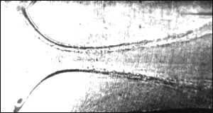 Mechanické metody vizualizace proudění plynů založené na nanášení kapalinových filmů a nátěrů jsou velmi rozmanité. Jedna z těchto metod využívá např. nátěr petroleje či vhodného oleje se sazemi, které se při proudění formují do řad, jejichž směr odpovídá lokálním směrům proudění. Olej na povrchu těles je však také možné poprášit práškovou sírou a pak při proudění silně vlhkého vzduchu na povrchu kondenzují kapičky vody, které tvoří řady mající směr okolního proudění. Jindy lze obtékaný povrch potřít olejem a do proudícího vzduchu zavést rozemletou křídu, která se usazuje na povrchu v oblasti intenzívního víření. Poměrně rozšířená je i metoda, při níž se povrch tělesa potře vrstvou oleje, který jeví fluorescenci v ultrafialovém záření. Při odtékání povrchu se tloušťka olejového filmu mění, a to lze v ultrafialovém záření pozorovat. Příklad vizualizace proudění vzduchu na vstupu do kanálu obdélníkového průřezu pomocí olejového nátěru boční stěny kanálu je uveden na obr. 4-4. Vzniklé kontury představují hranice proudu, ze kterých vidíme, že v důsledku nasávání vzduchu z okolního prostředí (ze všech směrů) se proud za vstupním průřezem kanálu nejdříve zužuje (vlevo) a pak teprve rozšiřuje do prostoru kanálu (vpravo).