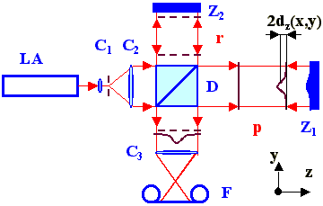 Obr. 9-1 Michelsonův interferometr (LA laser, C čočky, D dělič, Z1 měřený zrcadlový povrch, Z2 referenční zrcadlový povrch, F fotoaparát, p předmětový svazek, r referenční svazek, dz deformace zrcadla Z1 , 2dz deformace vlnoplochy v předmětovém svazku)