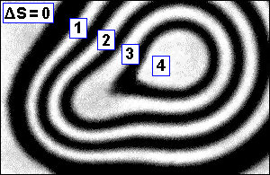kde D S(x,y) je změna interferenčního řádu v rovině x, y od referenčního místa a l je vlnová délka použitého světla. Příklad interferogramu deformací zrcadlového povrchu je uveden na obr. 9-2. V obrázku jsou navíc označeny interferenční proužky, a to čísly změny interferenčního řádu. Celočíselné hodnoty změny interferenčního řádu D S = ... -1; 0; 1; 2 ... jsou v místech světlých proužků, hodnoty D S = ... -1,5; -0,5; 0,5; 1,5; 2,5 ... jsou v místech tmavých proužků. Na obr. 9-2 je zvoleno jako referenční místo vlevo nahoře, kde D S = 0, další proužky se pak navzájem liší vždy o jedničku. Je zřejmé, že z daného interferogramu nelze přímo zjistit, zda interferenční řád směrem od referenčního místa roste či klesá a z toho pak zda deformovaný povrch je konkávní, či konvexní. To je třeba zjistit z nějakého doplňujícího měření, nebo na základě dalších informací či zkušeností. Je to obdobné jako např. u neoznačených vrstevnic na mapě pohoří, kdy je třeba zjistit, zda se nacházíme v oblasti hřebene či údolí.