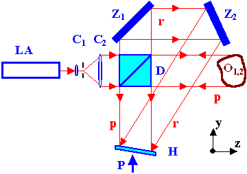 Sestava holografického Michelsonova interferometru je uvedena na obr. 9-3. Úzký světelný svazek paprsků z laseru LA je upraven pomocí čoček C1 a C2 (s využitím prostorového filtru, viz kap. 2.15) na paralelní svazek paprsků, který se na děliči D rozdělí na dva svazky. Předmětový svazek p osvětluje měřený objekt O. Světlo odražené od objektu se šíří zpět a dopadá pak skrz dělič D na fotografickou desku H. Druhý svazek r je po odraze na zrcadlech Z1 a Z2 usměrněn rovněž na fotografickou desku H. Svazek r plní funkci holografického referenčního svazku, nebo také rekonstrukčního svazku. Zařízení může pracovat metodou dvojí expozice, nebo také v reálném čase.