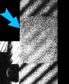 Vyhodnocování deformací měřeného povrchu či jeho posuvů lze provést stejně, jako v kap. 9.1, viz rov. (9-1). Příklad holografického interferogramu duralového kvádru s naftalenovou vrstvou ve střední části (označeno šipkou), který byl pořízen metodou dvojí expozice, je uveden na obr. 9-4. Mezi jednotlivými expozicemi byl kvádr mírně šikmo natočen a došlo k odsublimování části naftalenového povrchu. Velikost natočení lze vyhodnotit z polohy a hustoty šikmé osnovy proužků, odsublimování části naftalenového povrchu způsobuje pak zmenšení kontrastu interferenčních proužků na naftalenové vrstvě, které po delším působení sublimace zcela vymizí.