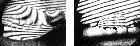 Na obr. 9-8 jsou uvedeny příklady mechanických deformací zubních protéz při skusu. Z obrázku vlevo je zřejmé, že snímací zubní protéza má zřejmě špatný kontakt s horní čelisti (vpravo nahoře), kde jsou hustší proužky kolem místa kontaktu. Z obrázku vpravo je pak vidět, že pevný zubní můstek čtyř zubů se vlivem skusu mírně zkrucuje. Tento zkrut se projevuje hustší osnovou proužků na můstku, vzhledem k osnově proužků na horní čelisti, která je rovnoměrně posunutá.
