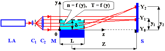 Princip vizualizace kontur pomocí stínové metody si můžeme nejlépe objasnit na schématu zařízení s paralelním svazkem paprsků, viz obr. 11-1. Pomocí laseru LA a čoček C1 a C2 je vytvořen paralelní světelný svazek s rovinnou vlnoplochou, který prochází v daném případě měřicím prostorem M s tepelnou mezní vrstvou T = f(y) (označenou čárkovaně) vznikající konvekcí okolo vyhřívané desky o délce L. Svazek paralelních světelných paprsků se při průchodu nehomogenitou n = f(y) v měřicím prostoru zakřivuje. V daném případě se jedná o průchod tepelnou mezní vrstvou T = f(y) při konstantním tlaku v měřicím prostoru. Na stínítku S umístěném ve vzdálenosti Z od středu desky vzniknou pak v důsledku kumulace zakřivených světelných paprsků okolo geometrického stínu desky Y0 dvě světelné kontury Y1 a Y2, což jsou oblasti s relativně větší intenzitou osvětlení.