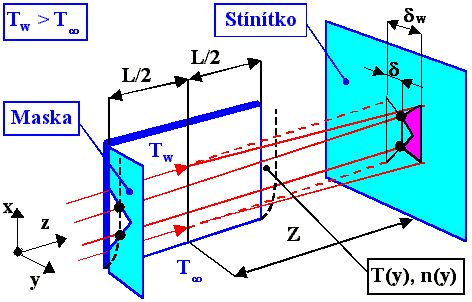 Zakřivení paprsků při průchodu nehomogenním transparentním objektem si lze snadno ověřit experimentálně. Na obr. 11-2 je znázorněno šíření světelných paprsků při průchodu tepelnou mezní vrstvou T = f(y) o tloušťce d při přirozené laminární konvekci ve vzduchu. Tepelná mezní vrstva vzniká v okolí vyhřívané vertikální desky o délce L a teplotě povrchu Tw, přičemž teplota okolního prostředí Too < Tw. V jisté vzdálenosti od náběžné hrany desky (dole) je teplotní pole prakticky jednorozměrné. Paralelní paprsky vstupují do mezní vrstvy skrz masku rovnoramenného trojúhelníka se základnou na povrchu desky a o výšce větší, než je tloušťka tepelné mezní vrstvy d. Při průchodu paprsků tepelnou mezní vrstvou se paprsky zakřivují směrem od povrchu vyhřívané desky, přičemž největší zakřivení mají paprsky šířící se nejblíže povrchu. Pokud by měla deska teplotu menší, než je teplota okolního prostředí, zakřivovaly by se paprsky opačně, směrem ke chladnějšímu povrchu.