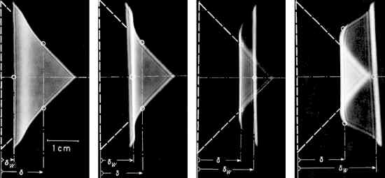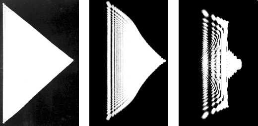Obr. 11-4 Stínogramy tepelné mezní vrstvy s trojúhelníkovou maskou pořízené v koherentním světle (na obrázcích zleva doprava je postupně zvětšována vzdálenost stínítka Z od vyhřívané desky) – Dostál, Pavelek [6-12]