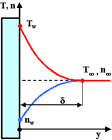 Obr. 11-5 Průběh teplot a indexu lomu v tepelné mezní vrstvě v oblasti laminárního proudění