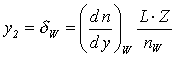 Druhým místem, od kterého vzniká kontura, je místo u povrchu y = 0, kde teplota je rovna teplotě povrchu Tw, viz obr. 11-5. Jelikož u teplosměnného povrchu je prvá derivace teploty či indexu lomu dle souřadnice y (dn/dy)w různá od nuly, bude poloha druhé kontury y2 na stínítku (viz. obr. 11-1 v kap. 11.1) závislá na vzdálenosti stínítka Z od středu desky. Polohu druhé kontury na stínítku lze vyjádřit použitím Snellova zákona, viz kap. 2.11