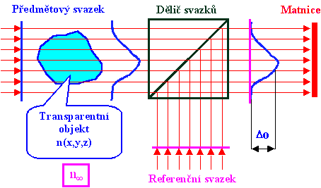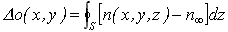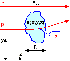 Při průchodu světelných paprsků nehomogenním transparentním objektem s indexem lomu n(x, y, z), viz obr. 13-1, dochází v důsledku různých rychlostí šíření paprsků jednak k fázovému posuvu paprsků a jednak k jejich zakřivování. Změna optické dráhy Do předmětového paprsku p vůči referenčnímu paprsku r, který prochází prostředím s indexem lomu noo, je dána křivkovým integrálem po dráze paprsku s