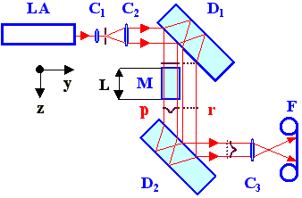 Obr. 13-3 Schéma Jaminova interferometru (LA laser, C čočky, D děliče, F fotoaparát, M měřicí prostor o délce L, p předmětový svazek, r referenční svazek)