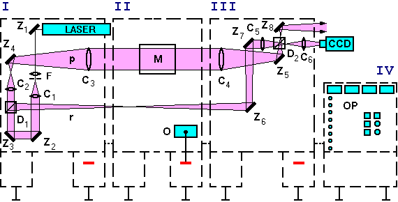 Obr. 13-6 Machův – Zehnderův interferometr firmy LKO Amerang (BRD) se zorným polem o průměru 200 mm (I zdrojový modul, II měřicí modul, III zobrazovací modul, IV ovládací modul, Z zrcadla, F prostorový filtr, C čočky, D děliče, p předmětový svazek, r referenční svazek, M měřicí prostor, O ovladač ustavení modulů, OP ovládací panel)