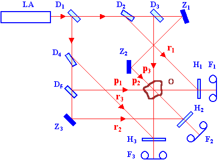 Schéma interferometru pro holografickou tomografii s možností tří směrů pozorování transparentního objektu, je uvedeno na obr. 13-13. Toto zařízení, používané např. na univerzitě v Hannoveru [6-7], umožňuje oproti interferometru z obr. 13.12 přesnější měření, jelikož jsou v něm exaktně definovány směry pozorování a směry šíření svazků objektem pro případné korekce na zakřivení paprsků. Jedná se vlastně o tři holografické Machovy - Zehnderovy interferometry (viz kap. 13.7), jejichž předmětové svazky p1 až p3 svírají navzájem např. úhel 45°. Každý předmětový svazek dopadá na vlastní fotografickou desku (hologram) H1 až H3, kde při expozici hologramu interferuje se svým holografickým referenčním svazkem r1 až r3. Při práci v reálném čase je třeba používat k záznamu interference současně a synchronizovaně tři fotoaparáty F1 až F3, nebo tři kamery. Sestava na obr. 3-13 je uvedena jen v základních rysech, jelikož zde nejsou čočky pro úpravy svazků a čočky pro zobrazení objektu do fotoaparátů. Uvedený interferometr nemusí sice ke své činnosti používat bezpodmínečně holografický záznam, ale holografická varianta potlačuje nežádoucí interferenci od nedokonalých optických prvků.