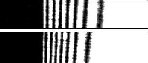 V práci Panknina [3-12] je prováděn výzkum současného přestupu tepla a látky z vyhřívaných vertikálních desek a horizontálních válců pokrytých naftalenovou vrstvou. Při záznamu daných objektů pomocí dvou různých vlnových délek l1 = 632,8 nm a l2 = 457,9 nm dostaneme dva odlišné interferogramy. Typický detail laminárních mezních vrstev získaný pomocí dvou vlnových délek je zobrazen na obr. 13-19. Výsledkem uvedených výzkumů je rozložení teplot a koncentrací naftalenu v daných transparentních objektech (kap. 18.9) a především parametry přestupu tepla a látky, které lze získat z derivací teplot a koncentrací u povrchů těles (kap. 18.10 a kap. 18.14).