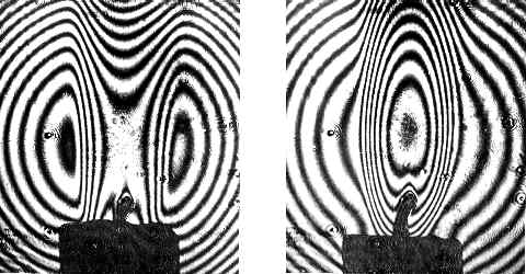 V konečné fázi seřizování interferometrů pracujících v reálném čase je třeba seřídit vhodnou konečnou či nekonečnou šířku interferenčních proužků. Tento postup se však musí často opakovat i při vlastních měřeních, jelikož měřený objekt nebo okolní prostředí mohou ovlivňovat interferometr. Při daném seřizování se můžeme setkat s problémy, kdy nelze seřídit interferometr na nekonečnou šířku proužků a vznikají proužky kruhové, nebo u seřízení na konečnou šířku proužků jsou proužky zahnuté. Jedná-li se o kvalitní interferometr, můžeme tuto závadu odstranit posuvem čočky pro vytvoření paralelního svazku, čímž lze upravit sbíhavý či rozbíhavý předmětový svazek na svazek paralelní. Zda se jedná o sbíhavý či rozbíhavý svazek je možné zjistit např. vložením plamene svíčky do měřicího prostoru, viz obr. 21. Typický interferogram teplotního pole plamene svíčky ve sbíhavém svazku je uveden na fotografii vlevo a typický interferogram teplotního pole plamene svíčky v rozbíhavém svazku je uveden na fotografii vpravo (v teplejším vzduchu se paprsky šíří rychleji a tím deformují vlnoplochu směrem dopředu). Při tomto postupu je však třeba předpokládat, že referenční svazek je paralelní s rovinnou vlnoplochou.