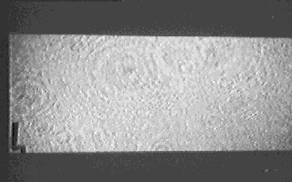 Příklad upravené videosekvence časově neuspořádaného děje ve formátu *.gif je uveden v souboru video 2. Jedná se o interferogram dynamického teplotního pole neizotermního proudu ze štěrbinové vzduchotechnické vyústky s poměrem stran 37:1 [6-12]. Teplota vzduchu v ústí vyústky je o 29 K vyšší než teplota okolního vzduchu a výtoková rychlost je 1,09 m.s-1. Z videosekvence je zřejmá nestabilita proudu a oblasti turbulence, které se vyskytují nahodile vždy jen v určitých oblastech proudu. Dle teorie je intenzita turbulence větší na okrajích proudu, kde dochází k přisávání vzduchu z okolí do proudu. Videosekvence byla upravena tak, že bylo vybráno několik snímků s časovým krokem jedna minuta. Tento výběr umožní vyhodnocení delšího časového úseku s menším počtem vyhodnocovaných obrazů. Další informace o tomto výzkumu lze nalézt v přílohách P17 a P19.