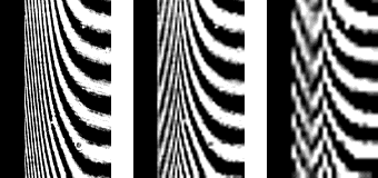 Obr. 15-2 Moaré obrazce při nedostatečném počtu obrazových bodů (interferogram tepelné mezní vrstvy u vertikální stěny s počty obrazových bodů 100 x 160, 50 x 80 a 25 x 40)