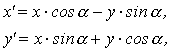 kde x, y jsou souřadnice původního bodu, x', y' souřadnice otočeného bodu a a úhel otočení. Úhel může být zadán buď udáním hodnoty a, nebo zadáním sklonu úsečky, která má být po otočení horizontální či vertikální. V případech kdy a = 90°, a = 180°, a = 270°, lze pouze vhodným způsobem zaměnit horizontální souřadnice za vertikální a naopak. Zvláštním případem otočení je zrcadlové převrácení obrazu podle horizontální nebo vertikální osy.