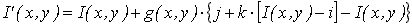 Výslednou intenzitu I'(x, y) obrazového bodu jako funkce původní intenzity obrazového bodu I(x, y), příslušného váhového koeficientu g(x, y) kontrastu k, jasu j a veličiny i dostaneme z rovnice