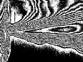 V uvedeném případě se nabízí aplikace postupu úprav obrazu tak, jak je to znázorněno na níže uvedených Obrazech 1 až 6 [4-14]. K původnímu obrazu proudu získanému zde kouřovou metodou (Obraz 1) je nejdříve přičten obraz šedého klínu (Obraz 2) a na složený obraz (Obraz 3), dle kap. 15.7, je aplikována funkce interferogram, dle kap. 15.4. Výsledným obrazem je tzv. "falešný" interferogram (Obraz 6), vypadající jako interferogram při seřízení interferometru na konečnou šířku proužků v referenční oblasti, viz kap. 13.1 a kap. 13.11. Zde se jedná o vertikální osnovu proužků, jelikož šedý klín má změnu intenzity ve směru horizontálním. Z výsledného obrazu (Obraz 6) lze lépe vyhodnocovat hranice proudu než z původního obrazu (Obraz 1), jelikož intenzita obrazových bodů v původním obraze je obvykle vnímána různými subjekty různě a může být i různě upravena funkci kontrast a jas (kap. 15.4). Uvedené zpracování vizualizačního záznamu (videosekvence), bylo provedeno pomocí software Interfer-Visual (kap. 16.9).