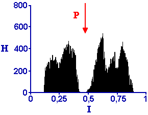 Funkci zobrazení histogramu můžeme s výhodou použít také před aplikací algoritmu prahování, viz kap. 15.4. Histogram nám může v této souvislosti usnadnit volbu vhodného prahu P, tak jak je to uvedeno na obr. 15-16.