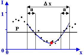 Vyšetří se extrémy proložené funkce a v případě, že extrém odpovídá minimu při prokládání okolí minima intenzit, či maximu při prokládání okolí maxima intenzit (a navíc leží ve vyšetřovaném intervalu Dx), lze jej považovat za střed interferenčního proužku.