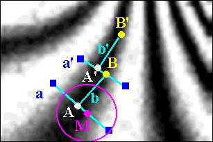 Objekty typu interferenčních proužků lze nejlépe popsat křivkami procházejícími středy proužků. V těchto místech má totiž interferenční řád vždy hodnoty S = .. -1; -0,5; 0; 0,5; 1; 1,5 .. Místo křivek je vhodnější použít lomené čáry, které mohou popsat jednodušeji libovolně složité proužky, včetně proužků uzavřených. Nevýhodou daného přístupu je ale nutnost řešení problému proužků typu T (větvení proužků). Pro určování průběhů středů proužků lze použít různé algoritmy. V lit. [4-11] je porovnávána metoda určování středů proužků z jeho hranic, metoda ztenčování proužků, geometrická metoda a genetické algoritmy. Jako nejlepší se ukázala geometrická metoda, schematicky uvedená na obr. 16-5.