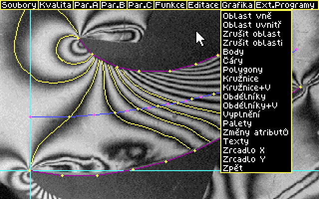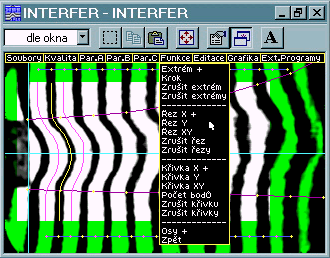 Další příklad interaktivního vyhodnocování interferogramu pomocí software Interfer 2.0 je uveden v přiloženém souboru obraz 1. Jedná se o interferogram pole hustot při proudění lopatkovou mříží tvořenou zakřivenými Lavalovými dýzami [6-17]. V interferogramu je zobrazen souřadný systém, dvě křivky ohraničující povrchy lopatek, řez v ose dýzy s automatickým vyhodnocením rozložení interferenčních proužků (dle algoritmu z kap. 16.3) a jednotlivé automaticky určené lomené čáry průběhů středů interferenčních proužků (dle algoritmu geometrické metody).