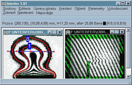 Pracovní formulář software Interfer verze 3.01 je uveden na obr. 16-12. V horní části pracovního formuláře je hlavní dialogové menu. Pod tímto menu se nachází lišta, ve které bývají ovládací prvky pro nastavování parametrů aktuálních funkcí. Důležitý je stále aktivní informační řádek, kde nalezneme informace o pozici aktuálního bodu v obraze vzhledem k zavedenému počátku souřadného systému (v obrazových bodech a v mm), o vzdálenosti aktuálního bodu od počátku, o úhlu polohového vektoru aktuálního bodu a informace o barvě aktuálního bodu. Největší prostor je vyhrazen pro okna s vyhodnocovanými obrazy. V dolní části pracovního formuláře se pak nachází stavový řádek s pokyny pro právě prováděný příkaz či s pokyny o průběhu zvolené funkce.
