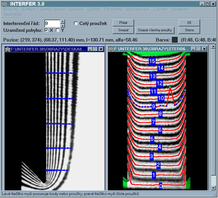 Ve vedlejším menu Vyhodnocení nalezneme také dvě editační funkce. Jedná se především o funkci Editace proužků (viz přiložený soubor obraz 1), která umožní editovat všechny výše uvedené lomené čáry, včetně jejich pořadových čísel či interferenčních řádů. Dále je zde funkce Přeskupení proužků, která umožní měnit libovolně pořadí interferenčních proužků, vyhodnocených řezů s polohami interferenčních proužků a interaktivně určených lomených čar v datovém souboru *.DAT.