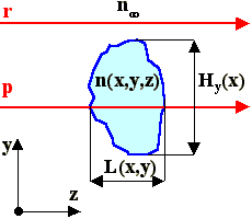 Transparentní objekt je prostorový útvar, který umožňuje průchod záření. Rychlost šíření záření v tomto objektu a tím také index lomu n je ale odlišný od okolního prostředí a bývá funkcí souřadnic x, y, z. Jelikož se následující text zabývá především vyhodnocováním interferogramů, kde zakřivení paprsků při průchodu transparentním objektem se považuje za parazitní jev, budeme zakřivení paprsků v dalších úvahách zanedbávat. Obecný transparentní objekt je uveden na obr. 17-1. Transparentní objekt je definován primárními fyzikálními veličinami, ke kterým patří rozložením indexu lomu n(x, y, z), ale někdy je postačující definovat transparentní objekt jeho tvarem. Tvar transparentního objektu je pak dán jeho tloušťkou L(x, y), nebo velikostí jeho obrysů Hy(x) či Hx(y).