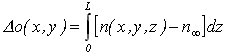 Index lomu způsobuje změnu optické dráhy, a to dle vztahu (13-1), který je uveden v kap. 13.1. Pro přímočaré šíření paprsků je pak rozdíl optických drah Do(x,y) dán vztahem